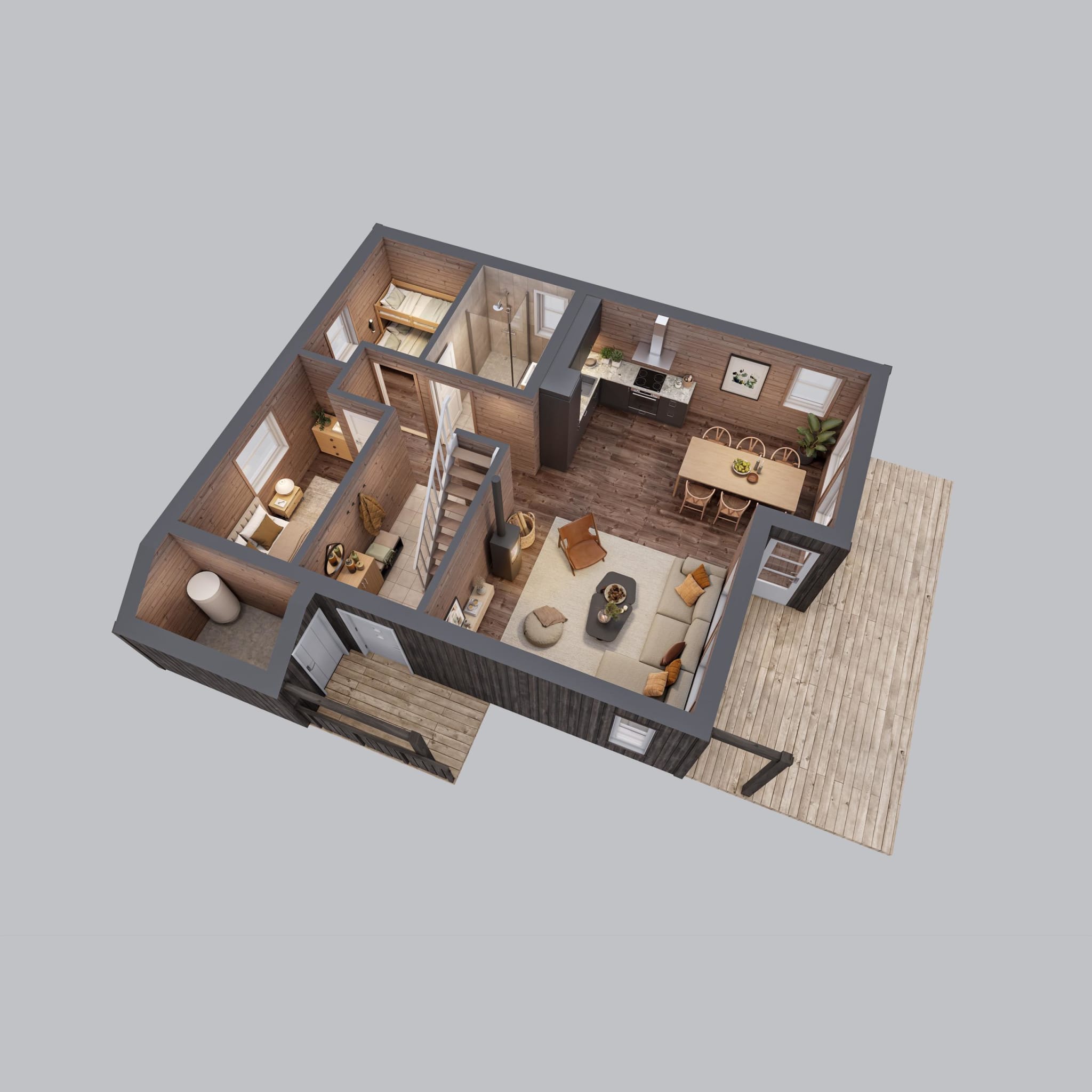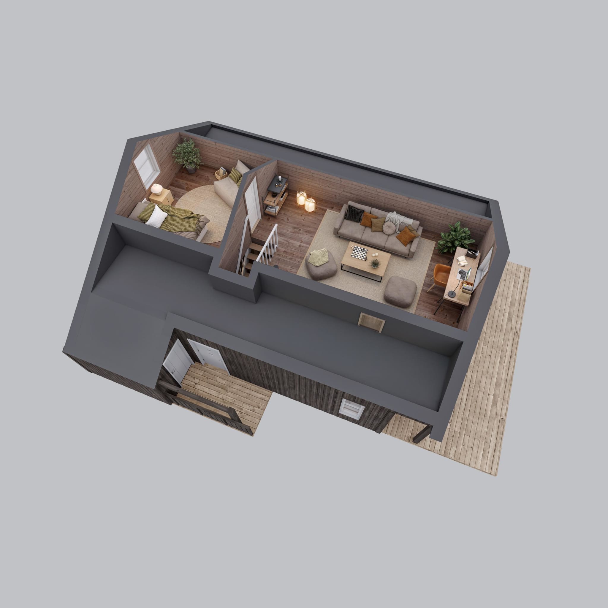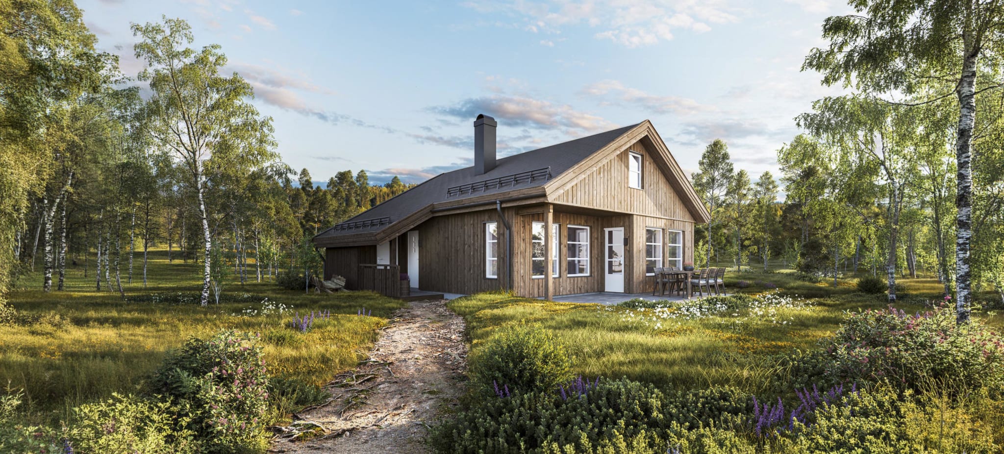 Hytta leveres med to forskjellige uttrykk – Trend og Tradisjon. Trend som er vår standardleveranse med stående låvepanel og store vindusflater med avtagbare sprosser, og shingel tak. Eller Tradisjon som, har et lunere uttrykk med villmarkspanel og smårutete vinduer med avtagbare sprosser og shingel tak.