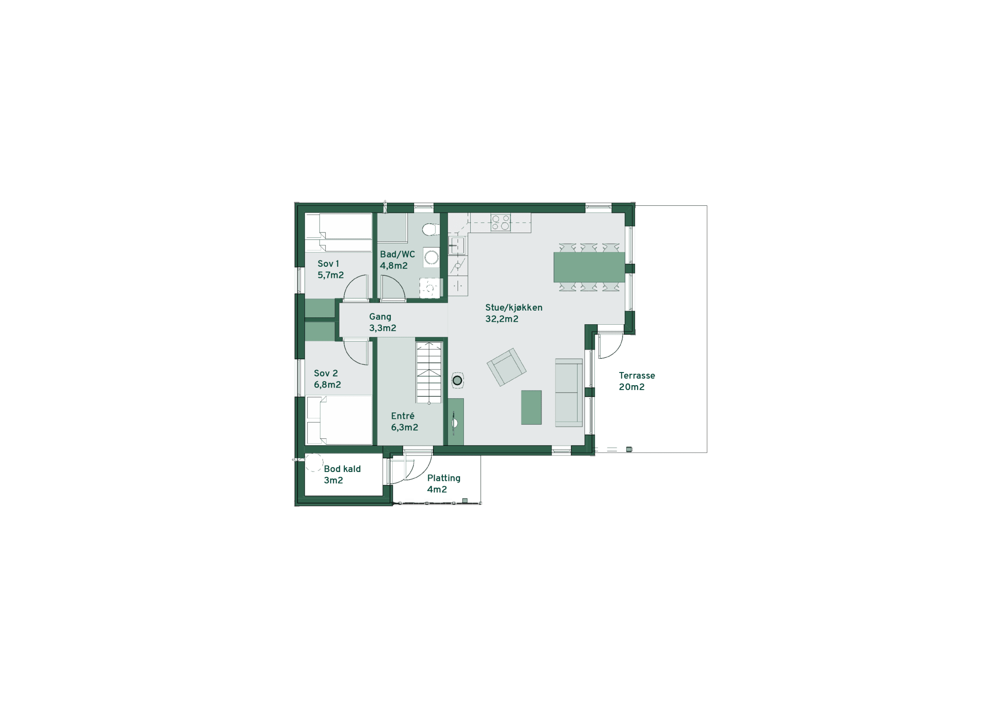 Soverommene ligger samlet i en egen del av hytta og gir en rolig sone litt unna oppholdsrommet. Badet ligger lett tilgjengelig i gangsonen og rommer alt du trenger i hverdagen. Entréen gir en praktisk og ryddig ankomst, og en kald bod ved inngangen gjør det enkelt å oppbevare utstyr som hører til ute.