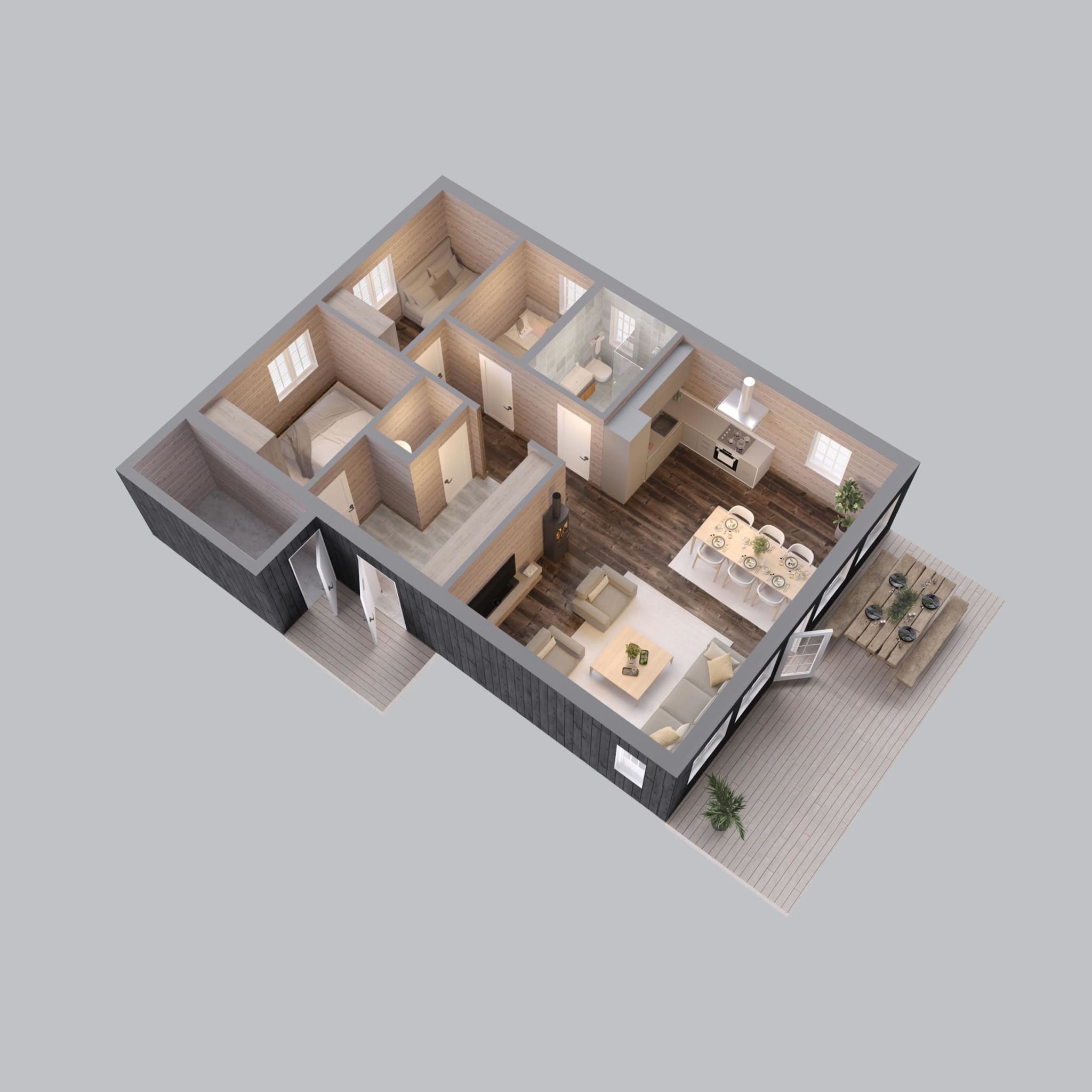 Furutangen 75E gir en fin balanse mellom åpne soner og rolige private rom. Hytta er lett å møblere og enkel å bruke i hverdagen. Med flere soverom og god plass rundt bordet er dette en solid og prisgunstig familiehytte.