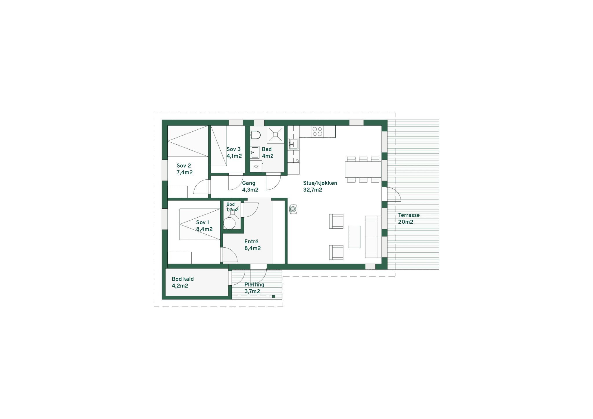 Soveavdelingen består av tre rom som ligger samlet og skjermet fra hovedsonen. Badet ligger praktisk plassert mellom oppholdsrommet og soverommene. Den romslige entréen gir en ryddig ankomst med god plass til yttertøy, og en liten bod gjør det enkelt å holde orden på småting.