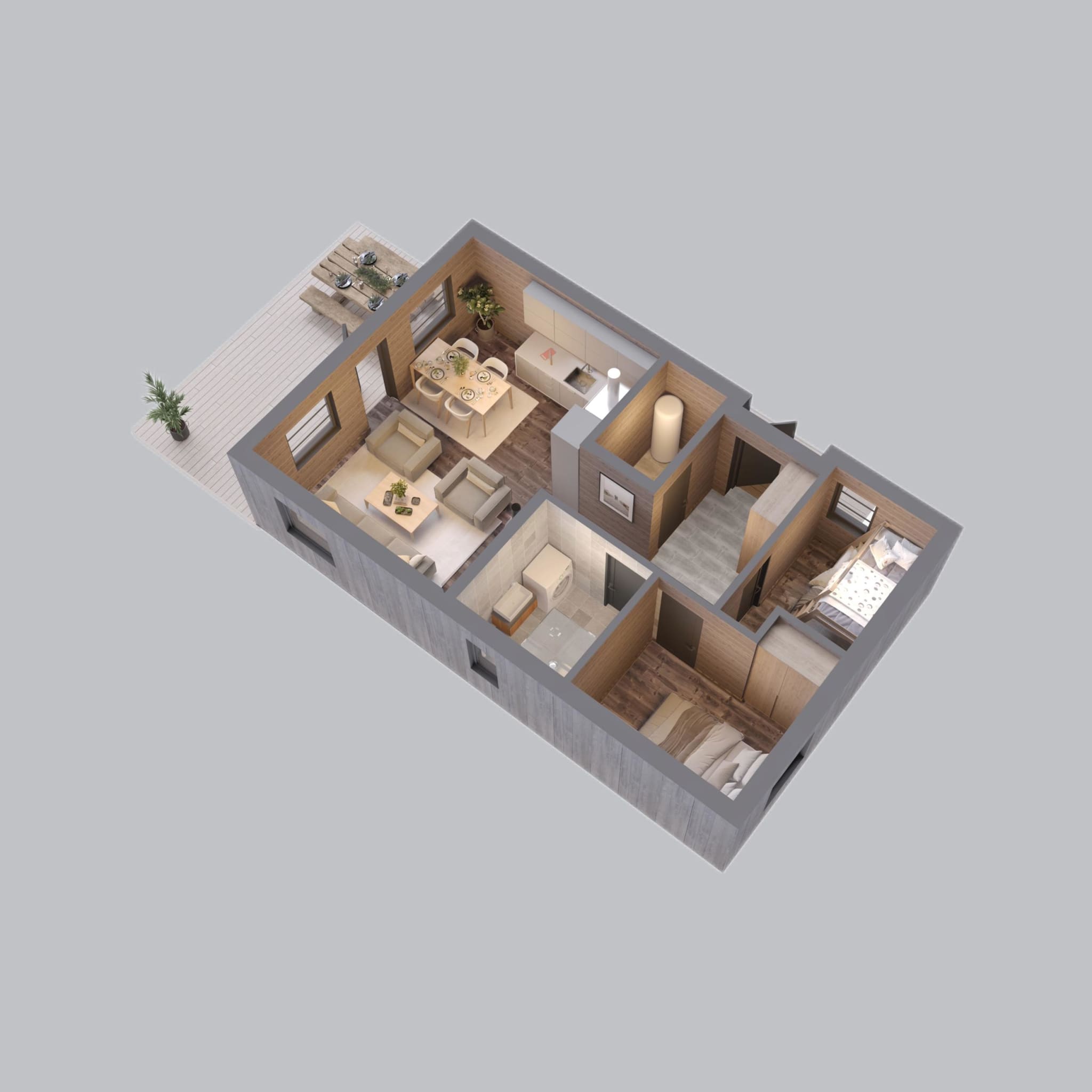 Mjuken 50 gir en lettbrukt og oversiktlig hytteopplevelse på ett plan. Den åpne løsningen mellom stue og kjøkken skaper en samlende atmosfære, og de gjennomtenkte rommene gjør hytta behagelig i bruk året rundt.