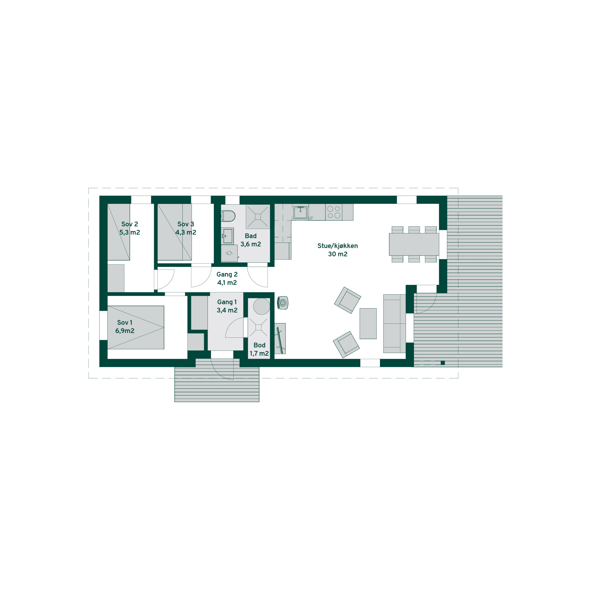 Mjuken 65 er en sjarmerende hytte med alt på ett plan. Hytta har en fornuftig og godt arealutnyttet planløsning med tre soverom, bad, bod og stue/kjøkken.