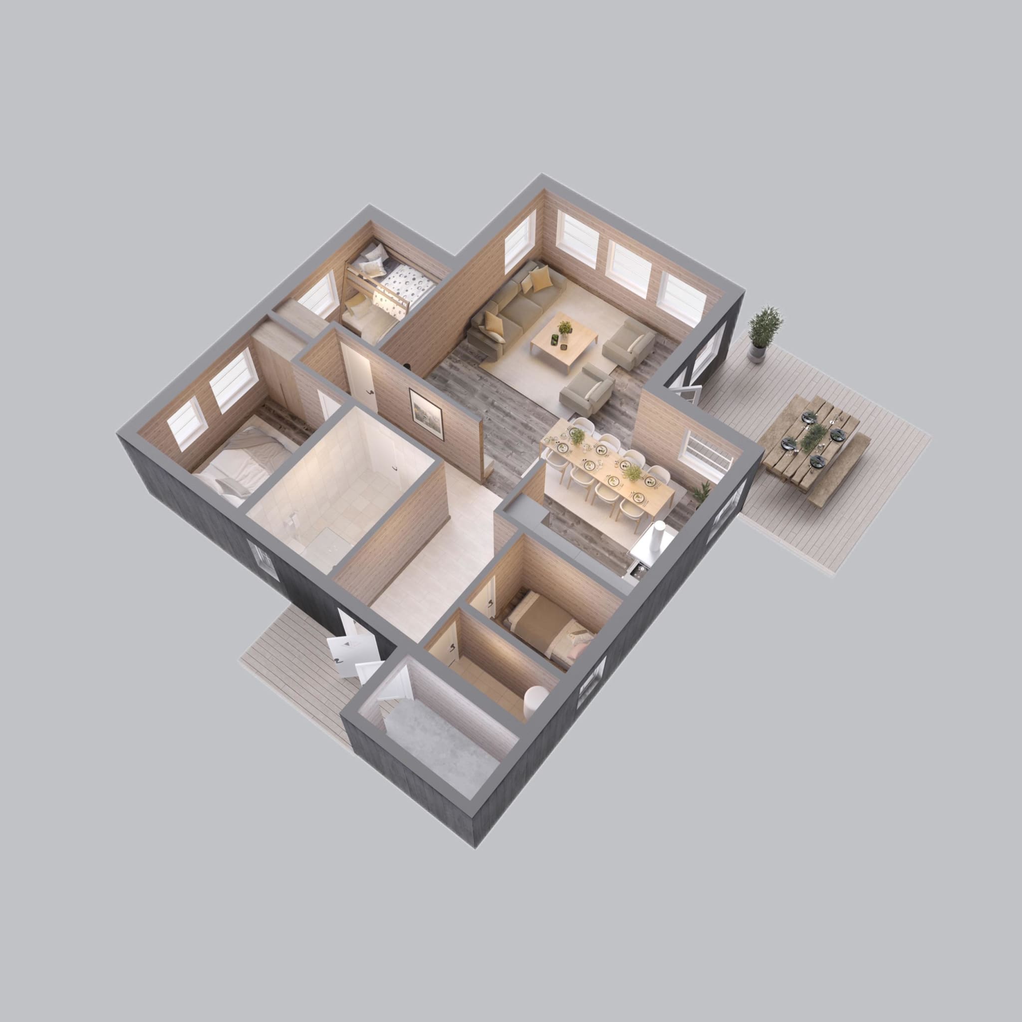 Rondablikk 85E er en trivelig hytte der oppholdsrommet får en naturlig hovedrolle. Soverommene er godt plassert og gir ro når dagen er over. En stødig og gjennomtenkt modell som passer både små og store familier.
