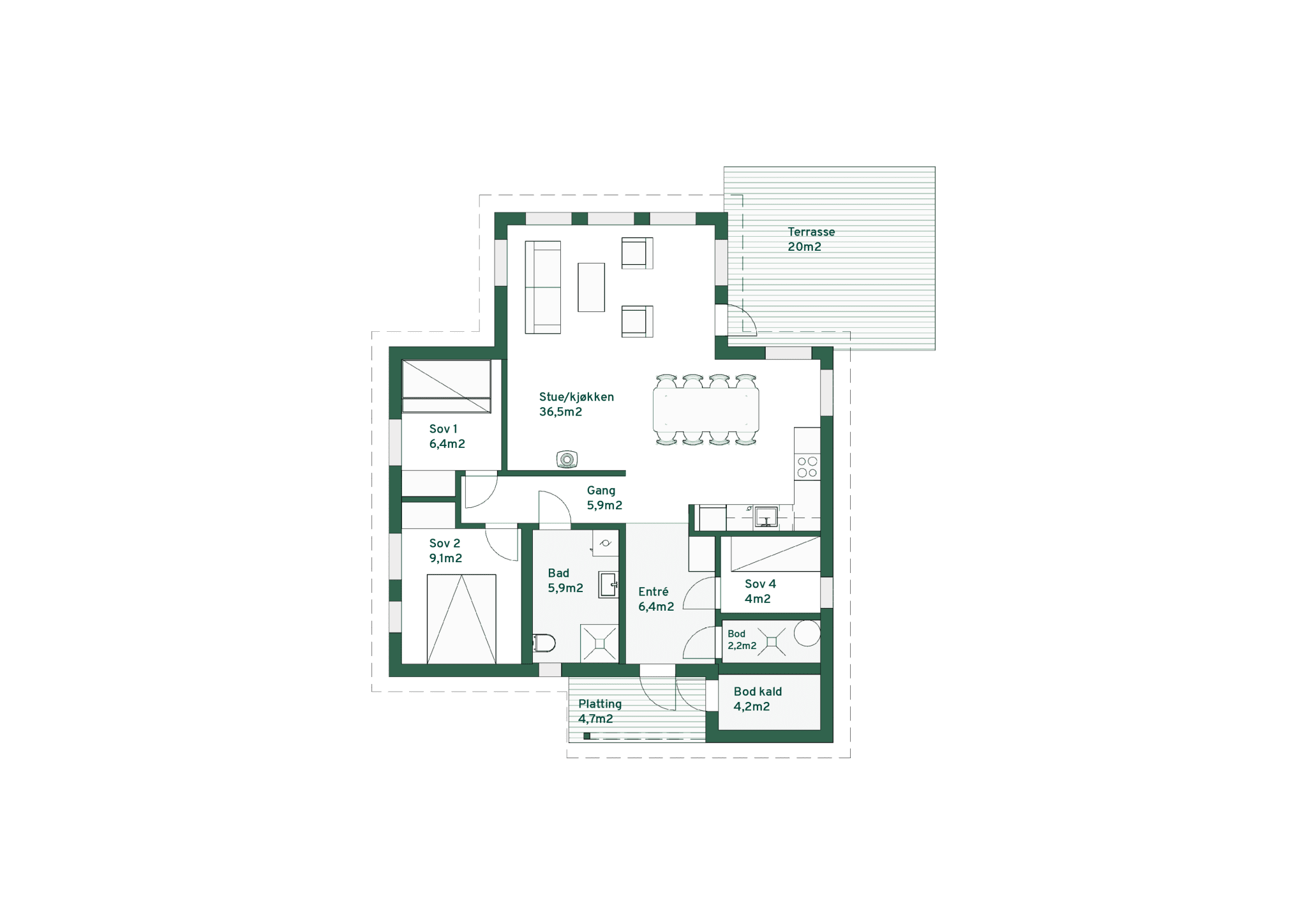 Soveavdelingen består av fire rom plassert i to separate soner, noe som gir både privatliv og fleksibilitet. Badet ligger sentralt plassert med enkel tilgang fra alle soverommene. Entréen er romslig og gir en ryddig ankomst, og både innvendig bod og kald bod ved inngangen gir gode lagringsmuligheter. Den lille plattingen ved inngangen gir hytta et lunt og velkomment førsteinntrykk.