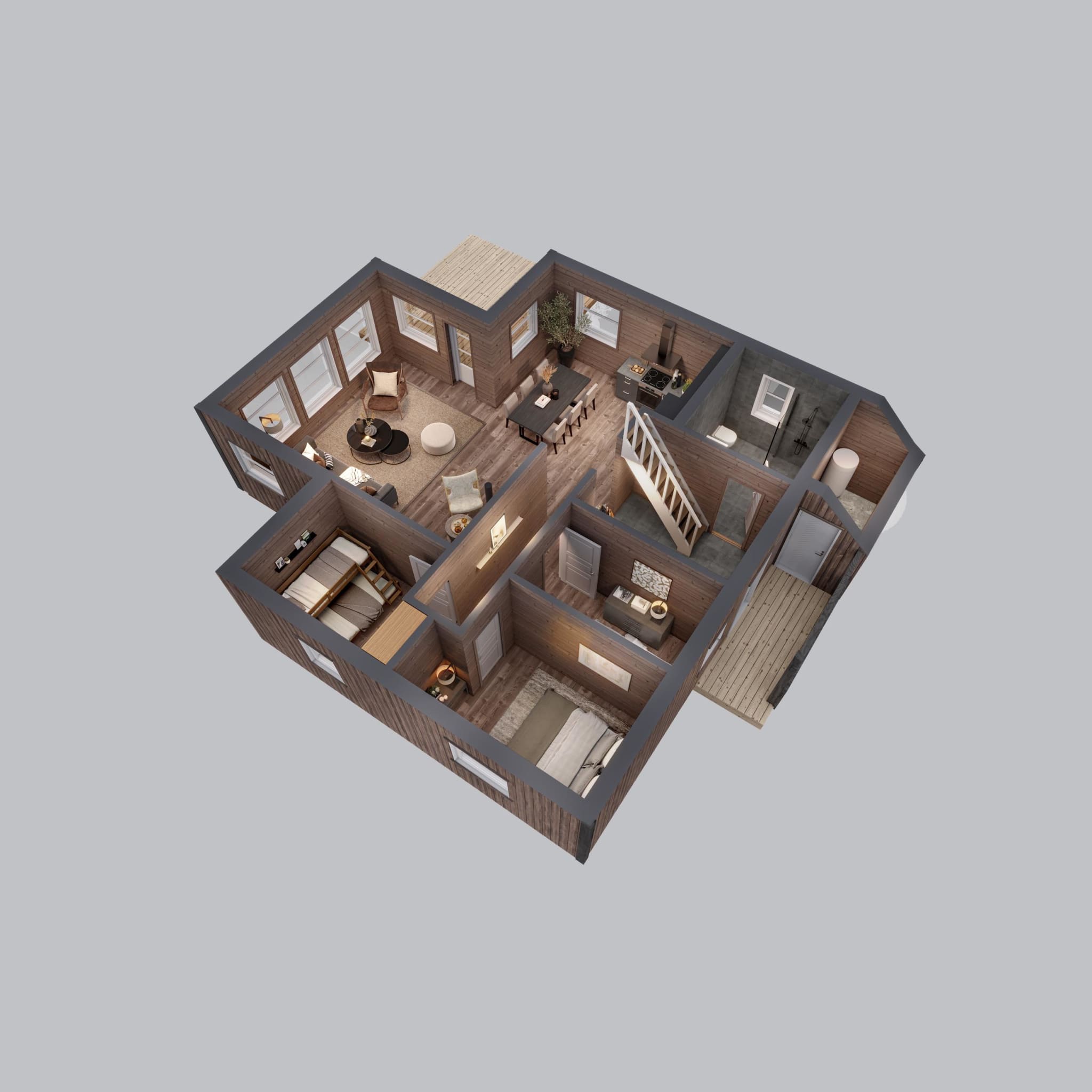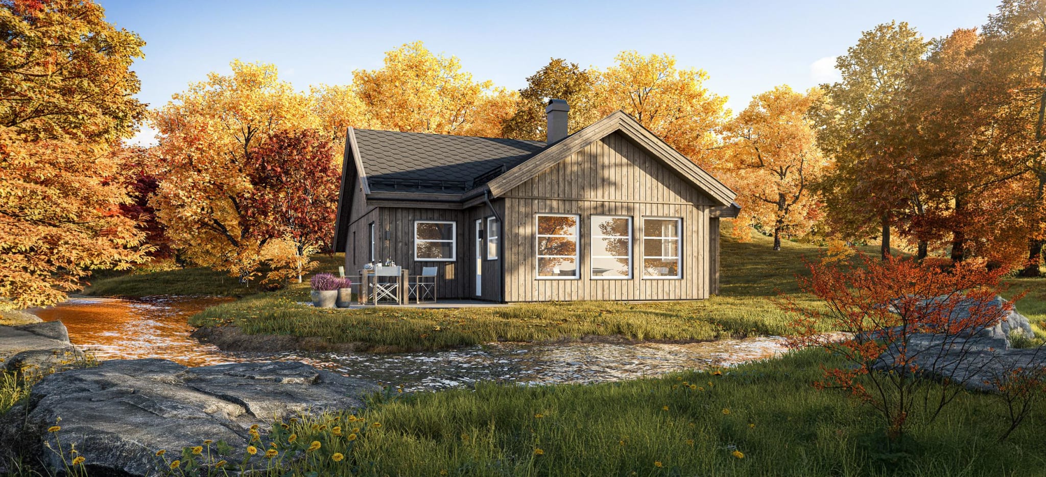 Hytta leveres med to forskjellige uttrykk – Trend og Tradisjon. Trend som er vår standardleveranse med stående låvepanel og store vindusflater med avtagbare sprosser, og shingel tak. Eller Tradisjon som, har et lunere uttrykk med villmarkspanel og smårutete vinduer med avtagbare sprosser og shingel tak.