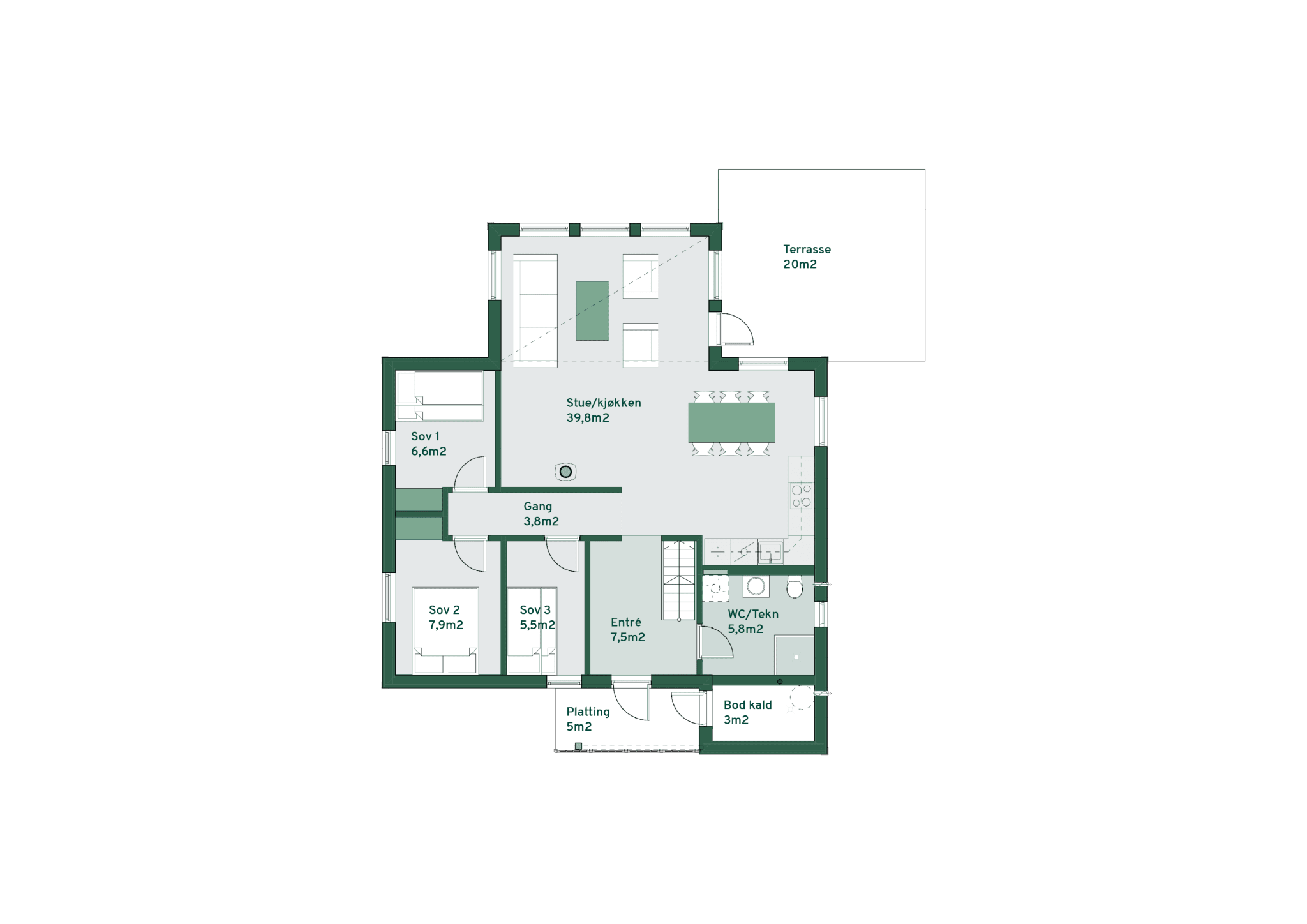 Hytta har et stort og lyst allrom der stue og kjøkken samles i en åpen løsning med god plass til både spisebord og sofakrok. De store vinduene slipper inn mye dagslys, og utgangen til terrassen gjør det enkelt å bruke uteområdet som en naturlig del av oppholdsrommet.